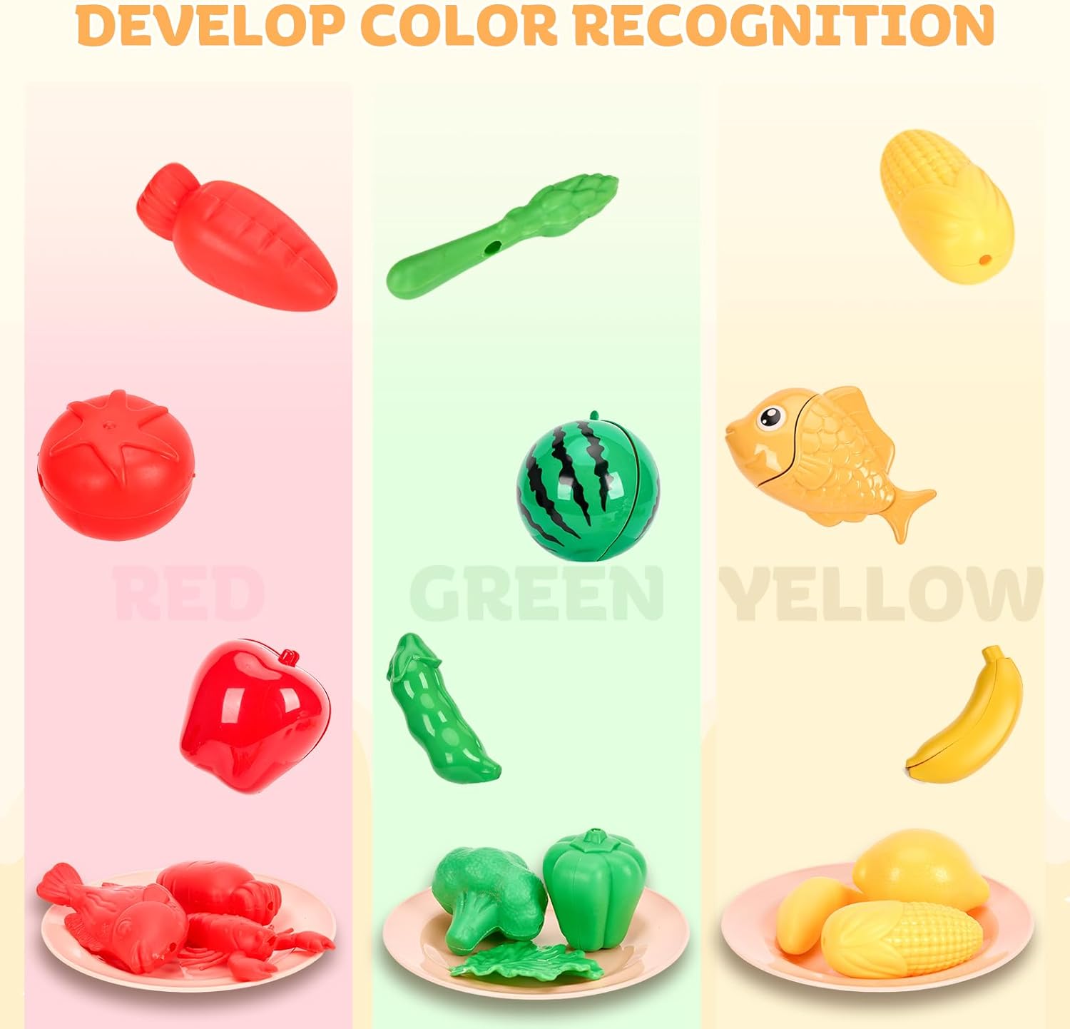 Los niños pueden ensartar carne y verduras en brochetas para la barbacoa, armar sus propias hamburguesas y disfrutar de la satisfacción sensorial de cortar fruta y pescado con un crujido. Incluso hemos incluido alimentos pelables: ¡pueden pelar el plátano, sacar los guisantes de la vaina y cascar el huevo!